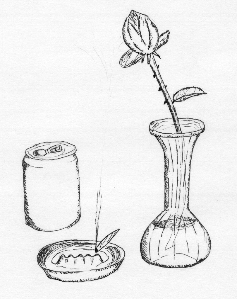 It's not really obvious, but the water in the vase is supposed to be beer and the joint is killing the flower, which represents love.